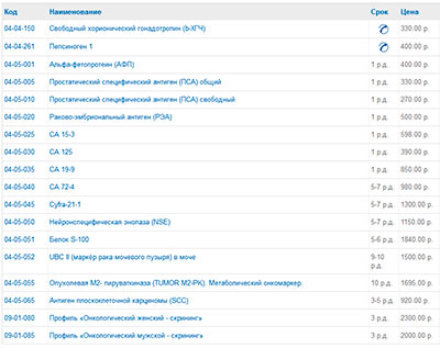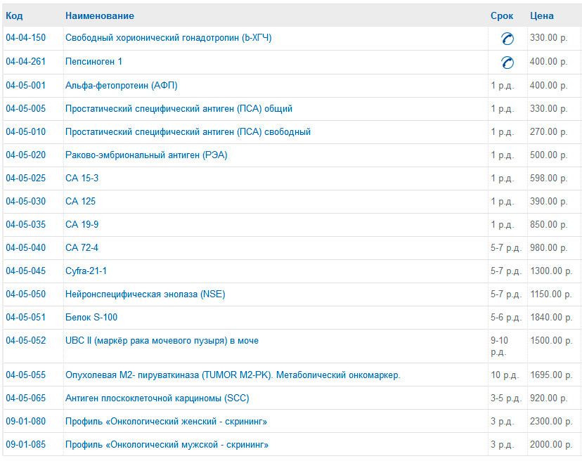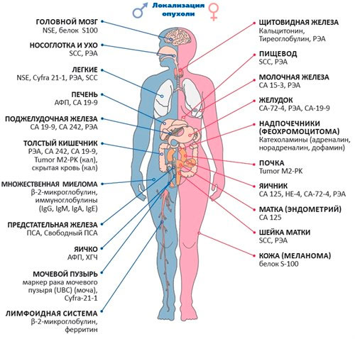 Известен широкий спектр маркёров для различных форм и локализаций злокачественных опухолей. Лаборатория Медилаб предлагает для анализа широкий спектр онкомаркёров, самые распространенные: ПСА, РЭА, АФП, раковый антиген СА-125 и многие другие.